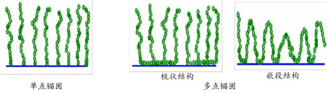 超分散劑的結(jié)構(gòu)。分子結(jié)構(gòu)按其具有的性質(zhì)和功能可分為兩部分:一部分為錨固基團(tuán):如-NR2、-NR3+、-COOH、-SO3H、-PO4H2、-SO3-、-PO42-、多元胺、多元醇及聚醚等(如圖),它通過離子鍵、共價(jià)鍵、氫鍵及范德華力等作用形式緊緊地吸附于顆粒表面,不易脫附,錨固段在整個(gè)超分散劑分子結(jié)構(gòu)中所占比例很小,一般占10